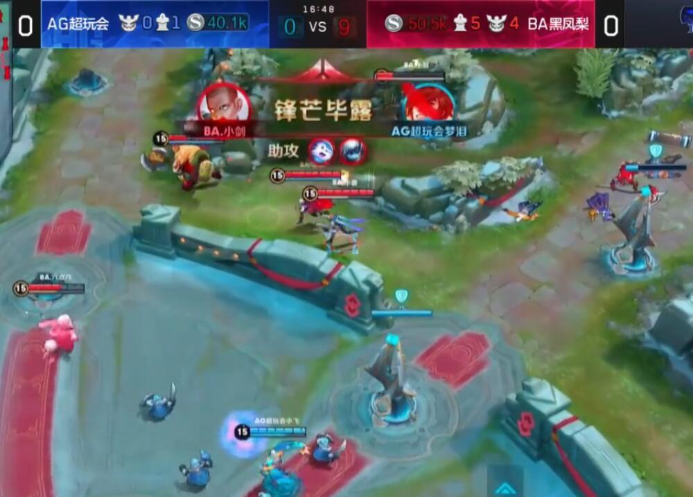 第一场双方一开始就打的比较激烈。BA黑凤梨完全是初生牛犊不怕虎,强行和AG超玩会对攻,最终还成功取得到团战的胜利。然后前中期就一直占据了优势。最后一波,AG超玩会的鬼谷子开大强上,结果被牛魔抓住破绽,直接一个预判大,击飞两人。最后AG超玩会的四名英雄都被追杀至死。BA黑凤梨拿下了第一局,这局AG超玩会甚至被零封,连一个人头都没拿到,实在是有点悲剧啊!