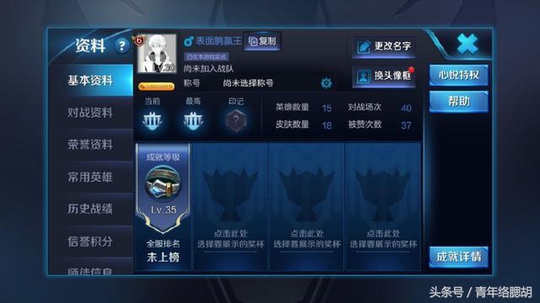 这位玩家的经验等级已经达到了最高,成就等级却不高,段位也不高,然而他仅仅打了40场,也就是说该玩家可能一直在打排位,并且都赢了,这才有了铂金3的段位,英雄比皮肤还少,只有15个,果然是“最穷”的贵族七。
