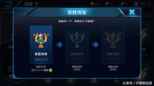 常胜将军最高成就需要达到连赢三十局的条件,试问这样的条件全服能有几个人能够达到。小编最多只拿过12连胜,再往上要么队友坑的不行,要么对手是代练,根本没法玩。。。
