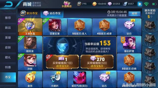 如果铭文和铭文页差不多已经齐了,那就选择钻石夺宝,201次必出王者水晶,而王者水晶兑换的英雄和皮肤,目前就只有三个,但后期应该还会不断加入的。