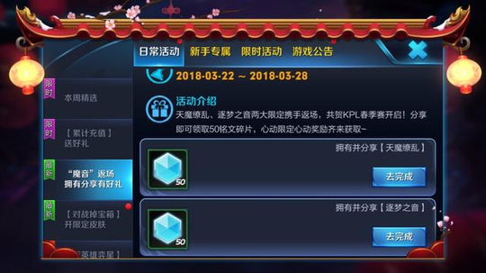 只要每日参与匹配或者排位以及娱乐模式就可以可掉落KPL春季赛宝箱,每日上限3个,打开宝箱有机会获得返场皮肤天魔缭乱/逐梦之音或热门英雄吕布和貂蝉!