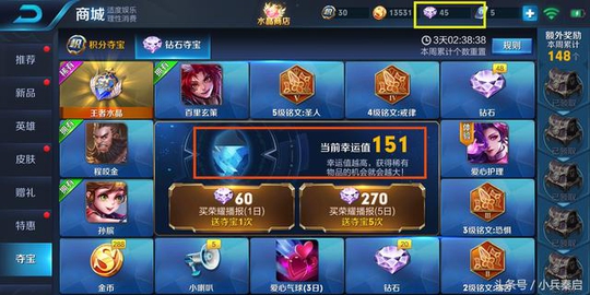 现在王者荣耀消耗钻石有两种途径,一种是通过积分夺宝,另外一种是钻石抽取铭文。哪一种方法获利最大?根据上一回的经验,是积分夺宝的收益最大,咱们就从这里开始测试,小号一共有5389枚钻石,幸运度为零,从零开始抽王者水晶。