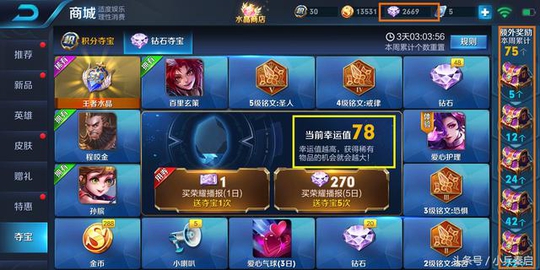 积分夺宝的好处就是每次抽奖,基本都会抽到钻石,也就是可以一边消耗钻石,一边又得到钻石补充,当完成右边所有宝箱的奖励之后,还剩2669钻石,这才消耗不到3000钻石,这还没算打开宝箱的回馈。