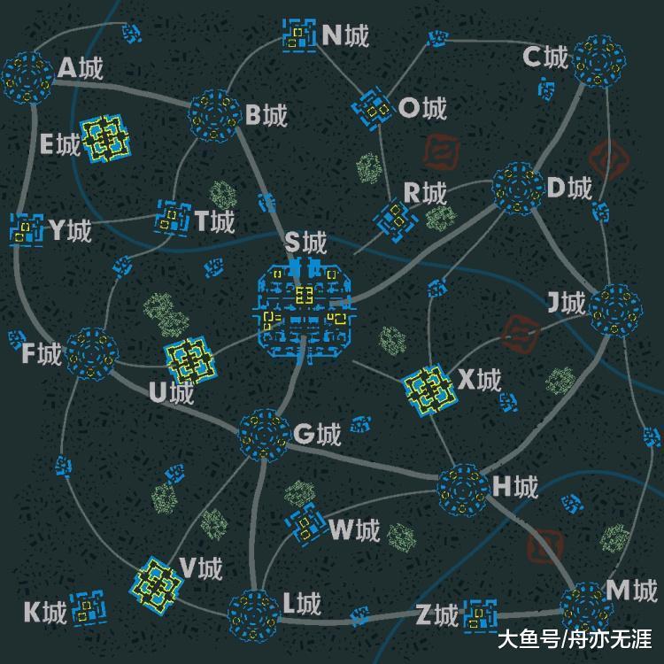 图中每个“城市”都具有不同的地形,还标注着一些黄色的醒目符号;联想到吃鸡中搜装备捡空投,王者荣耀中可能会变更为获取不同加成BUFF,就像无限乱斗一样,只不过需要自己去抢。