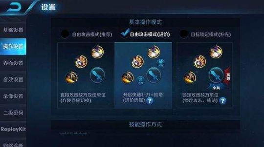 这里我们可以做好这个设置,把基本操作模式设置成补刀和推塔,这样子有利于我们在对线上的补兵以及有敌方小兵时也能正常推塔,至于团战中容易出现的打不到自己想输出的英雄,我们可以设置一下“头像锁定”,这样有利于优先打后排和残血,避免打肉。