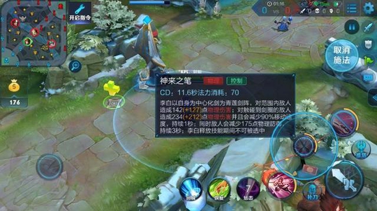 二技能神来之笔,神来之笔使用时是一个画地为牢的圈,会对圈内和圈边上的英雄输出伤害,而且敌方英雄在圈边上被击中是,会降低其护甲和移动速度,圈边上造成的伤害是要比圈内的要高, 释放二技能时,李白处于无敌、不可选中攻击的状态。