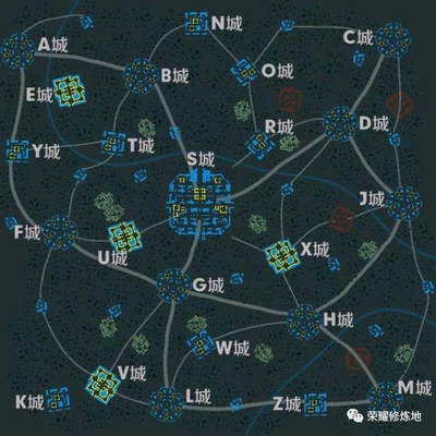 在前几天的体验服更新中加入了这个模式相关的基层文件,其中就有这个模式的地图,从地图上看,有ABCD等23个城,中心城为S城,是一个比较大型地图了。