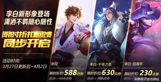 看完新模式巅峰赛的消息,我们再来看看27号更新后官方开启的一个限时减价活动,此次减价的英雄/皮肤为新版李白、千年狐和范海辛,其中史诗788皮肤千年之狐减价158,而288皮肤范海辛减价58,活动时间为3月27号到4月2号,喜欢李白的玩家可依据自身需求选择入手!