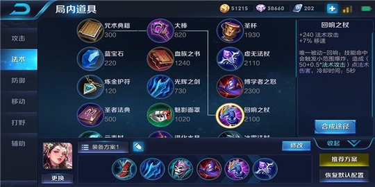①出装中非常难抉择的一点是第一件是否要出巫术法杖。个人认为出巫术法杖最大的作用是其被动“强击”,但“强击”的加成是受法强影响的,在前期没有其他法强装备的支撑下没有太大必要。个人习惯是先只出一个“光辉之剑”,在面具帽子做完之后再将其合成巫术法杖。前期的杨玉环是十分缺少蓝量的,“光辉之剑”所带来的附加蓝量可以勉强凑合,无须出圣杯。