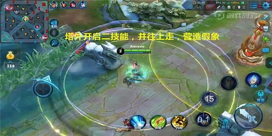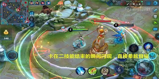 ②有一个小技巧,对线期敌方英雄残血塔下回城时,(熟练的杨玉环几乎每盘都能做到将敌方中单压制至残血回家这一点,)玩家可以在塔外开启二技能,掐好时间点闪现进塔眩晕住敌方,让其无法按出闪现,进而配合一技能和加强版普攻将其击杀。这是一个非常秀也非常令人意想不到的操作。如下图所示: