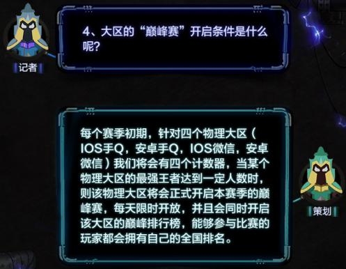 当一个大区的最强王者达到一定人数时,巅峰赛会限时开放。参与比赛的玩家都会获得自己的全国排名。因此如果想证明自己,就千万不要错过哦。