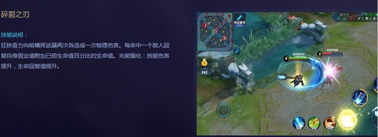 一技能看似一个非常普通的攻击技能,可是这个应对有一个特点,那就是能够回血,并且恢复的血量是按自己损失的生命值的百分比,并且效果还能够强化,这确保了狂铁能够有续航的能力.