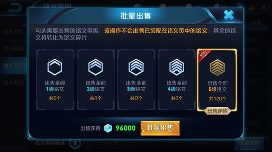 那就是土豪想把自己的五级铭文全部出售了,但是还没按批量出售,120个五级铭文这里价值要比上面的皮肤还要贵,毕竟5级铭文是很难拥有的,看到这里许多玩家都直呼:别冲动!不过土豪肯定是没有按的,只是想炫耀一下自己的财产而已.