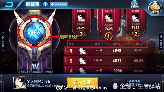 另外巅峰赛模式大厅中展示的并不是玩家的段位,而是巅峰积分和排行榜,后者包含了玩家的ID、大师分和战队信息,再依据玩家的积分高低进行排名!还不熟悉巅峰赛规则的小伙伴可以看看小编早前发布的专题介绍: