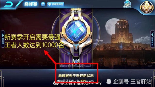 可以看到策划补充了一条在官方公告中并未提及的参与条件,即信誉积分需要达到100分,而通过下图中的未开启状态得知每个赛季重启巅峰赛则需要所在大区的最强王者人数达到10000名!
