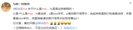 什么是MVP?通常给我们回答,无非就是最优秀的选手吧啦吧啦这样的解释,有些吃瓜群众还可能答不上来。但是,李九在现场给我们的解释是这样的:M是麦当劳、V是VIVO手机、P是浦发银行信用卡。连起来就是我们吃着麦当劳,手里拿着VIVO手机,兜里揣着浦发银行信用卡在现场看KPL!龟龟,当时小编我看到这里,心里就一个念头(如图)