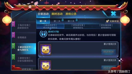 首先是最新的活动“峡谷狂欢节”,这个活动藏在了活动详情里面(而且没有提示),出现的玩家可能会错过这个活动换不了这么可爱的头像框了。