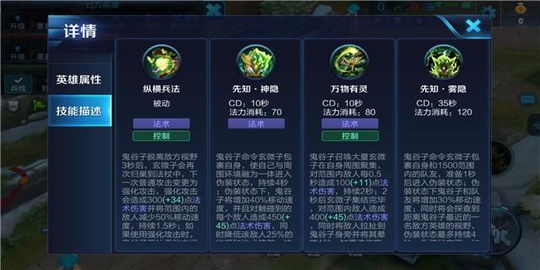 解析:鬼谷子1500范围内的队友,在延迟1秒后进入伪装模式,这与鬼谷子的一技能伪装相似,增加全体队友移动速度,在开团追击或者撤退,甚至是打埋伏时,鬼谷子的三技能都有很大的作用。