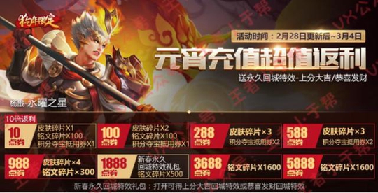 然后真的是不出小于所料。2.18为期一周的充值福利活动到2.26号结束;过了一天的时间,就又到了元宵节的活动,三款限定皮肤再次上线,所以王者再次上线了充值送福利的活动...
