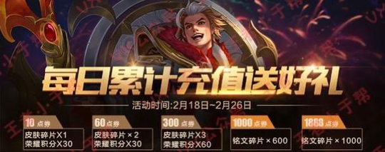 给大家看看从过年期间王者荣耀上线的每天累计充值送好礼的活动!第一次就是春节前上线的每日充值送好礼的活动,累计充值送皮肤碎片,第一次这个活动感觉还不错~