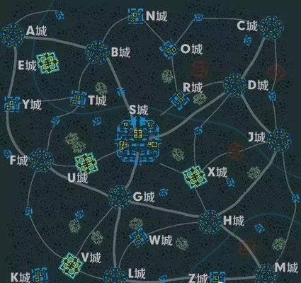 这个模式中的众多城池也都被取了各种各样的名字(暂以字母代替)。以S城为核心,其他的城市相互连接,看起来非常庞大。
