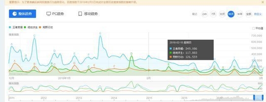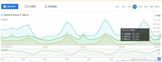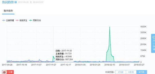 我们看早期一些的,荒野行动的微博热词搜索量在过年那几天居然异常的高,特别是除夕那天接近快400万的搜索量,不过随后断崖式下跌,估计那天是有什么活动所以导致搜索量这么高。