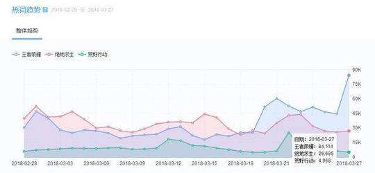 首先我们以王者荣耀,绝地求生和荒野行动3个热词在百度指数作对比,在3.27的搜索热度中王者荣耀表现依然抢眼有13万之多,绝地求生也有11万之多,而荒野行动也就只有近4w的搜索热度,可见最近荒野行动的表现确实很不理想。