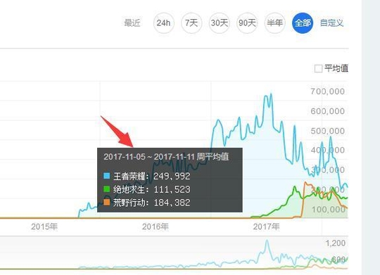 我们再来看整体的荒野行动最火的一段时间搜索百度指数显示的是2017年11月的第一周是荒野行动搜索量最高的时间段了那段时间也是荒野行动刚出来的时间确实很多人在玩。