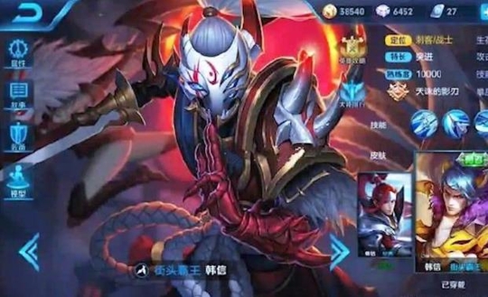 这是韩信的新皮肤,可以说直接碾压白龙吟,这款皮肤的韩信是带着面具,和白起、曹操无畏之灵的皮肤画风都一样,韩信虽然戴着面具但是头发和武器可以察觉他就是偷家之王韩跳跳