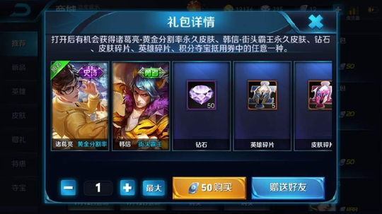 重复上述步骤,用小号再打两把韩信,再开启至少三个礼包就获得了韩信的街头霸王。究其原因是因为系统会自动检测到你的小号和你的大号,你的一个号上玩的好的英雄,必定会想购买,这时你再切回大号,系统会默认为是小号,于是抽奖概率大大提高。