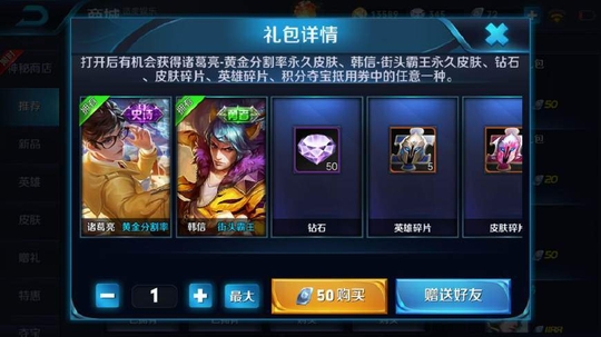 这位玩家刚开始买了一个五元的礼包,开启之后得到了五个英雄碎片,于是这名玩家没有立刻买下一个礼包,而是退出注销之后用自己的小号上去打了两把诸葛亮,并且赢得了比赛。退出小号之后迅速上大号买三个礼包,到背包中开启,就获得了诸葛亮的黄金分割率。