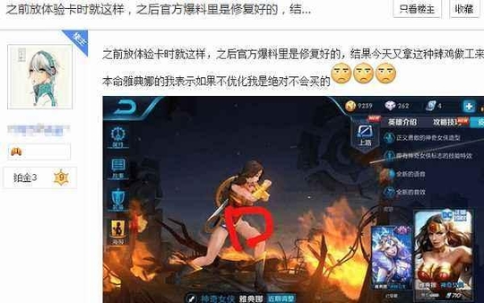 昨天神奇女侠正式上线之后,天美这次被骂惨了,为什么,我们来看一下。 很多玩家还是对新皮肤的渴望,尽管丑一点也无所谓,但是买完之后,土豪的网友们开始压抑了,因为神奇女侠出问题了。网友抱怨说:之前放体验卡时就这样,虽然之后官方爆料里是修复好的,动画里面的神奇女侠一点没问题,结果今天又拿这种辣鸡做工来坑人。