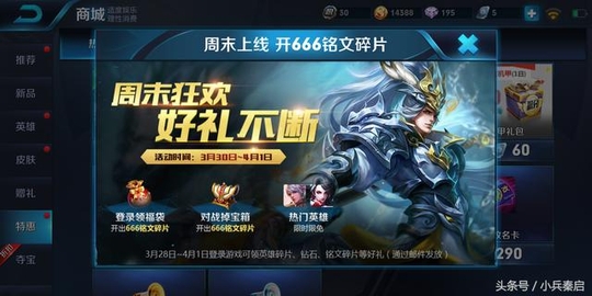 除了英雄秘宝限时购,周末狂欢的对战活动也同时上线。就是打完一局比赛会随机掉落宝箱,打开之后有几率得到666碎片,这个的几率看起来比抽奖还要低,反正小兵是从来没得过666的。