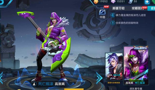 还有一款就是高渐离的死亡摇滚,这款是战队赛限定的皮肤,因为名字的原因所以造型设计的并不是以帅气为主。反正就是觉得丑。