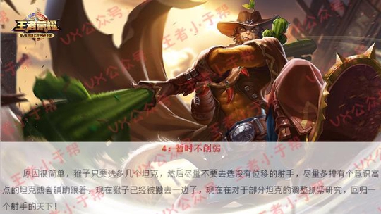 最后一个原因就是因为目前版本的状态导致其不会被削~为什么,上面也说到了,现在的版本是坦克的天下啊,所以玩家的意见已经转移到坦克身上了,自然而然的策划重点照顾的就是坦克了,所以猴子问题?起码要等到下个赛季再聊了~