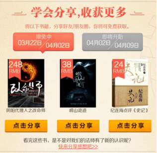 好书当然不能自己独享!快快分享给好友,大家一起来收获更多精彩故事吧!《阴阳代理人之改命师》、《崂山诡道》、《纪连海点评史记》,限免期间,这三本书分享给好友,就可以免费获得它们啦!快快与好友一起探索书中的奇妙世界吧!