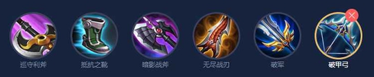 打野出装套路如下:巡守利斧+抵抗之靴+暗影战斧+无尽战刃+破军+破甲弓