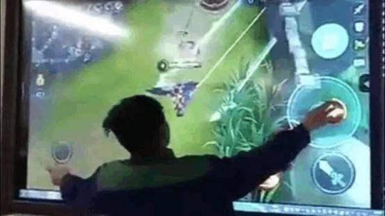 这应该是某个教育场所的触摸显示屏,虽然看着很霸气但估计也挺耗费体力,毕竟得大面积来回比划——一顿操作猛如虎,一看战绩二百五。用这个打游戏的人应该不是神对手,而是坑队友。