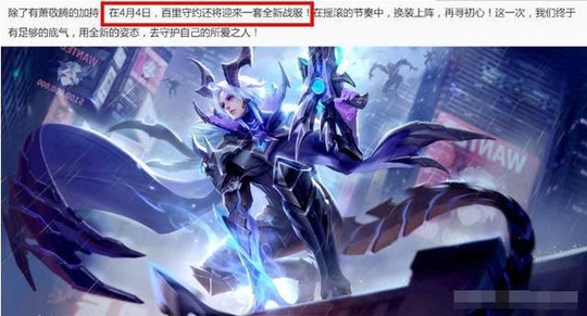 前两天官方公布了百里守约的主题曲,同一时间也最终确定了百里守约暗黑机甲史诗级别皮肤将于4月4日上线,最终定价888(首发710),玩百里守约的玩家可以小小的激动一下了哦!