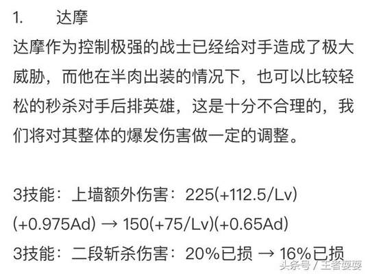 鉴于达摩在kpl的赛场强势开团,爆发高,脆皮被踢到很难逃生,所以大招削弱了一半伤害,感觉这一刀直接削废了达摩,之前削大招上墙距离都没有这次狠。