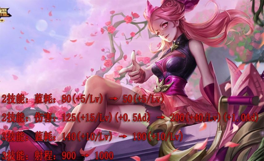 孙尚香强化比较大,二三技能削弱蓝耗,提升了伤害,大招射程增加,一段范围提高到了一千,加上二段的500范围,可以直接一塔外打中接近二塔周围的英雄。