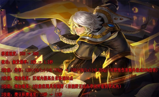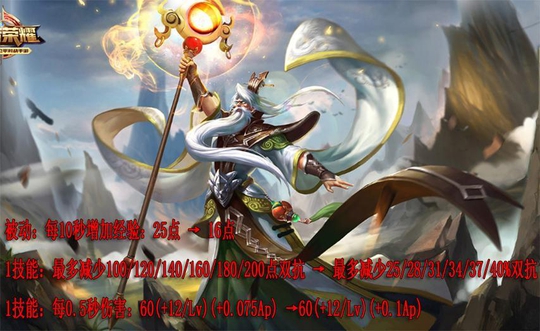姜子牙加强,虽然防御削弱变为了百分比数值,前期会一定削弱,但是后期非常实用,配合穿透装备基本上可以直接无视敌方防御。经验加成效果降低,队伍前期发育减慢,一技能伤害提高三分之一的加成。