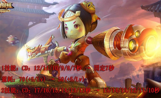 鲁班全面加强,一二技能的冷却时间降低非常多,特别是一技能固定七秒冷却,可以很快的触发被动扫射,并且蓝耗降低了二十点。