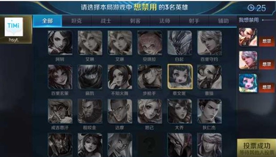 娱乐模式新推出禁用系统,可以由玩家投票选出三个被禁用的英雄,如果票数相同则由系统随机相同票数的英雄禁用。