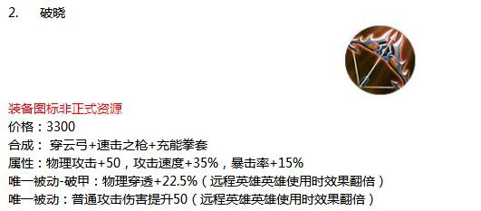 一般破军和贤者之书是针对物理和法术输出核心的两件超顶级装备,而到了后期破军缺少必要的攻速和暴击属性,几乎必出的破甲弓附带的冷却缩减属性对于以普攻为主要输出手段的射手英雄来说价值偏低。基于这些问题,官方设计了一件新的超顶级装备,一件价格3300金币!可以说是最贵的装备了