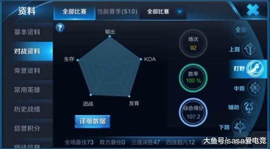 这是玩家用雅典娜打野的五星芒图,我们可以看到,五星芒图几乎全部都是满的,综合得分是107分,全场最佳是73分。这样的战绩让人看完了着实的让人羡慕,让人佩服。
