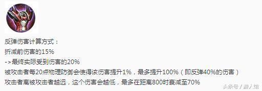 还有一个专门克制射手的装备就是反伤刺甲,新改版的这个反伤刺甲直接算实际受的伤害,并且和物理防御相关,最多也只到40%,关键是还受到距离的影响,这样对射手的克制就没有那么大了。