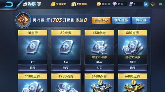 后面那些就不看了,就刚刚夺宝的那五款皮肤就已经足以让女土豪升级到贵族八了,但是土豪没有涨上去,估计就是运气太好,每次都可以用很少运气就抽到荣耀水晶,不然就解释不了,它可以用这么少钱,拥有这么多皮肤,毕竟这里的价值等于三个贵族八的金钱了,女土豪为了不然网友质疑,特意发了直接还差1703点券升到贵族八的图.为自己证明.许多土豪和网友看到这里之后,都直呼:过分了!