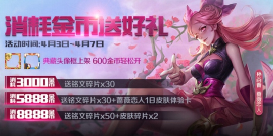 消耗金币活动开启,这次的活动是消耗指定数量金币获得皮肤碎片和蔷薇恋人体验卡,时间持续四天,按照惯例,下周二新英雄狂铁上架。