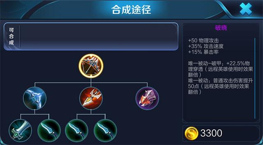 新装备破晓,价格3300,比破甲弓多了1200金币。